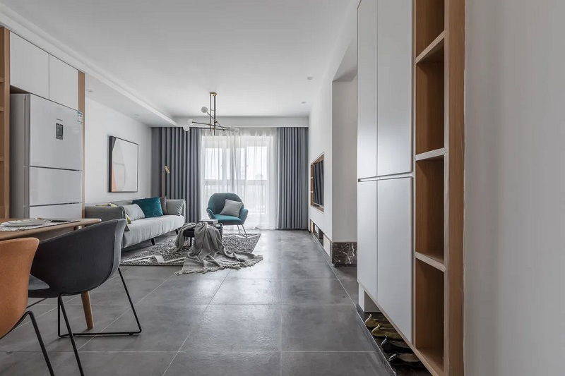 入戶進門,簡潔通透的視覺體驗。大白墻與灰色地磚結合,大氣優雅又不缺乏質感。在原廚房門洞位置設計嵌入式鞋柜,封閉式與開放式結合,提高了日常生活便利性,也不影響其他空間正常使用。