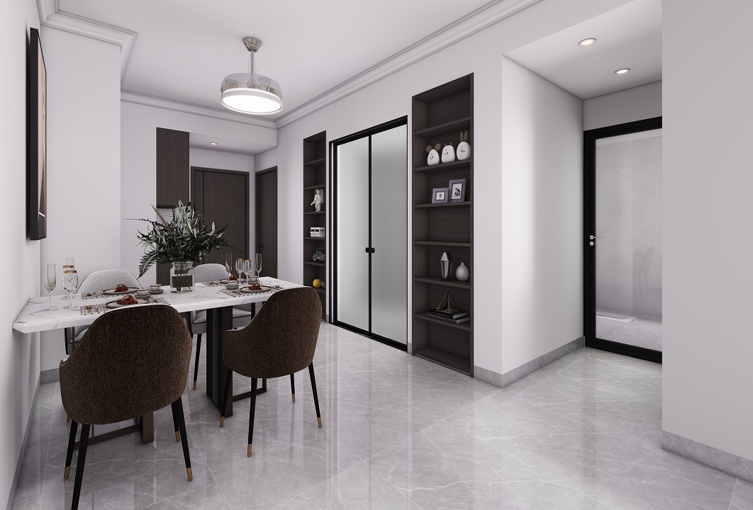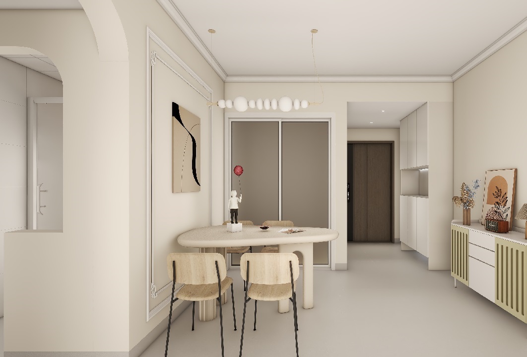 打開傳統廚房設置,加強廚房與餐廳一體化,緊密的將廚房與餐廳一體化,拓寬了空間視野的同時也擴大了實際的空間層次。冰箱位置的放置也加強了業主實際的使用便利性。