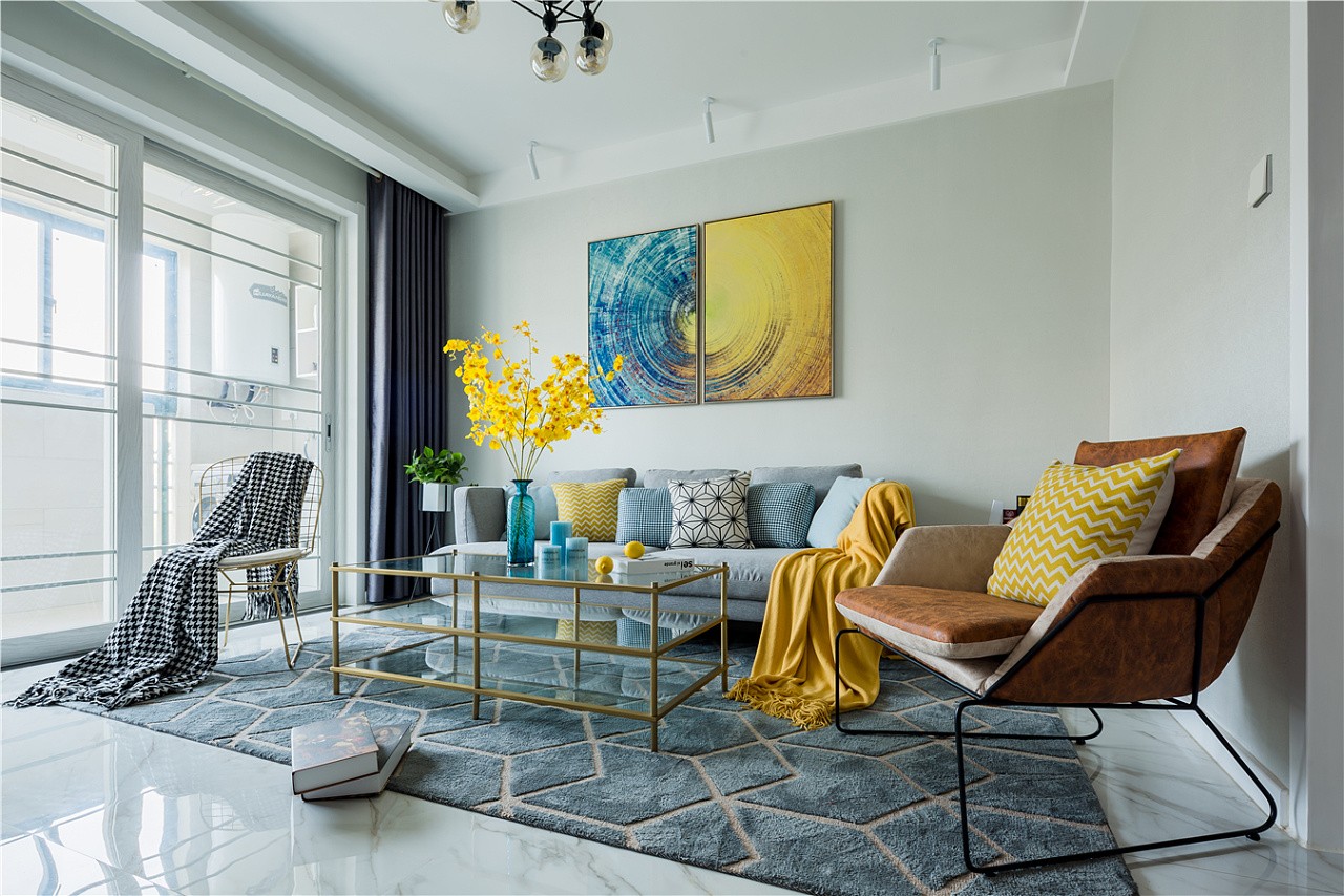 整體色彩簡約也是通過其他一些配飾畫龍點睛,如暖色枕、綠色植物、掛畫等,搭配低純度暖色,具有溫暖、親切的感覺。