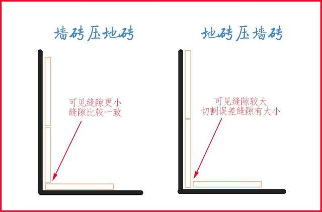 墻地面都需要貼瓷磚的地方,需要考慮墻磚壓地磚還是地磚壓墻磚。兩種貼磚方式最大的區別,是視覺效果。地磚壓墻磚,會留下一道向上的縫隙,俗稱“朝天縫”。這道縫非常明顯,而且非常容易在縫隙里積水。墻磚壓地磚,也會留下一道縫,不過這道縫就變成了朝向側面的。正常看過去,視線是斜向下的,看不到這道縫。