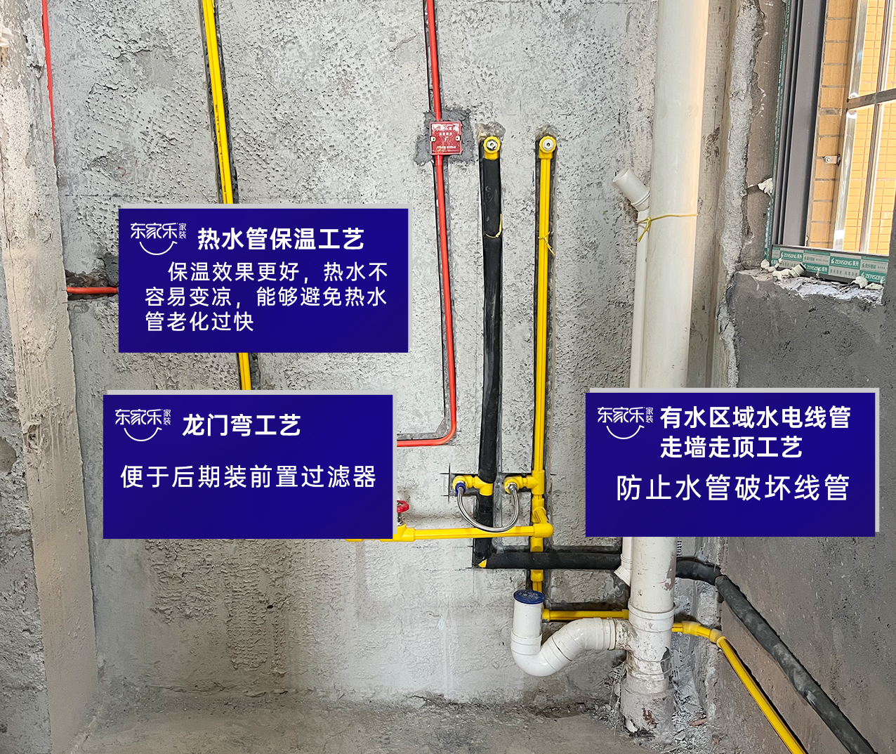 東家樂家裝的水暖工程,運(yùn)用冷熱水管保溫工藝、龍門彎工藝、有水區(qū)域水電線管走墻走頂工藝、連體內(nèi)絲彎工藝、給水管安裝等多項(xiàng)先進(jìn)工藝,保障了水路暢通,暖通使用更方便。