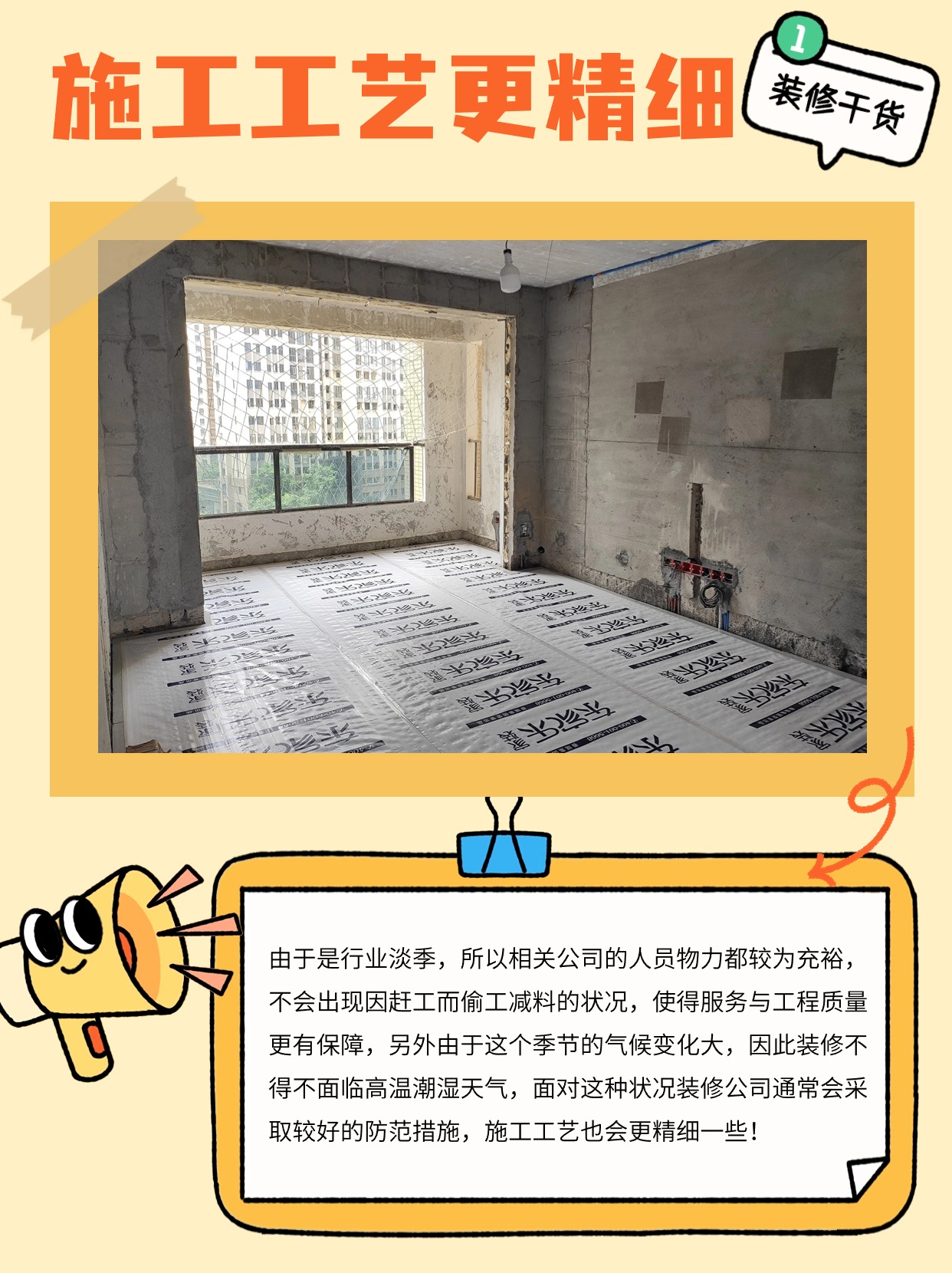 由于是行業淡季,所以相關公司的人員物力都較為充裕,不會出現因趕工而偷工減料的狀況,使得服務與工程質量更有保障,另外由于這個季節的氣候變化大,因此裝修不得不面臨高溫潮濕天氣,面對這種狀況裝修公司通常會采取較好的防范措施,施工工藝也會更精細一些!