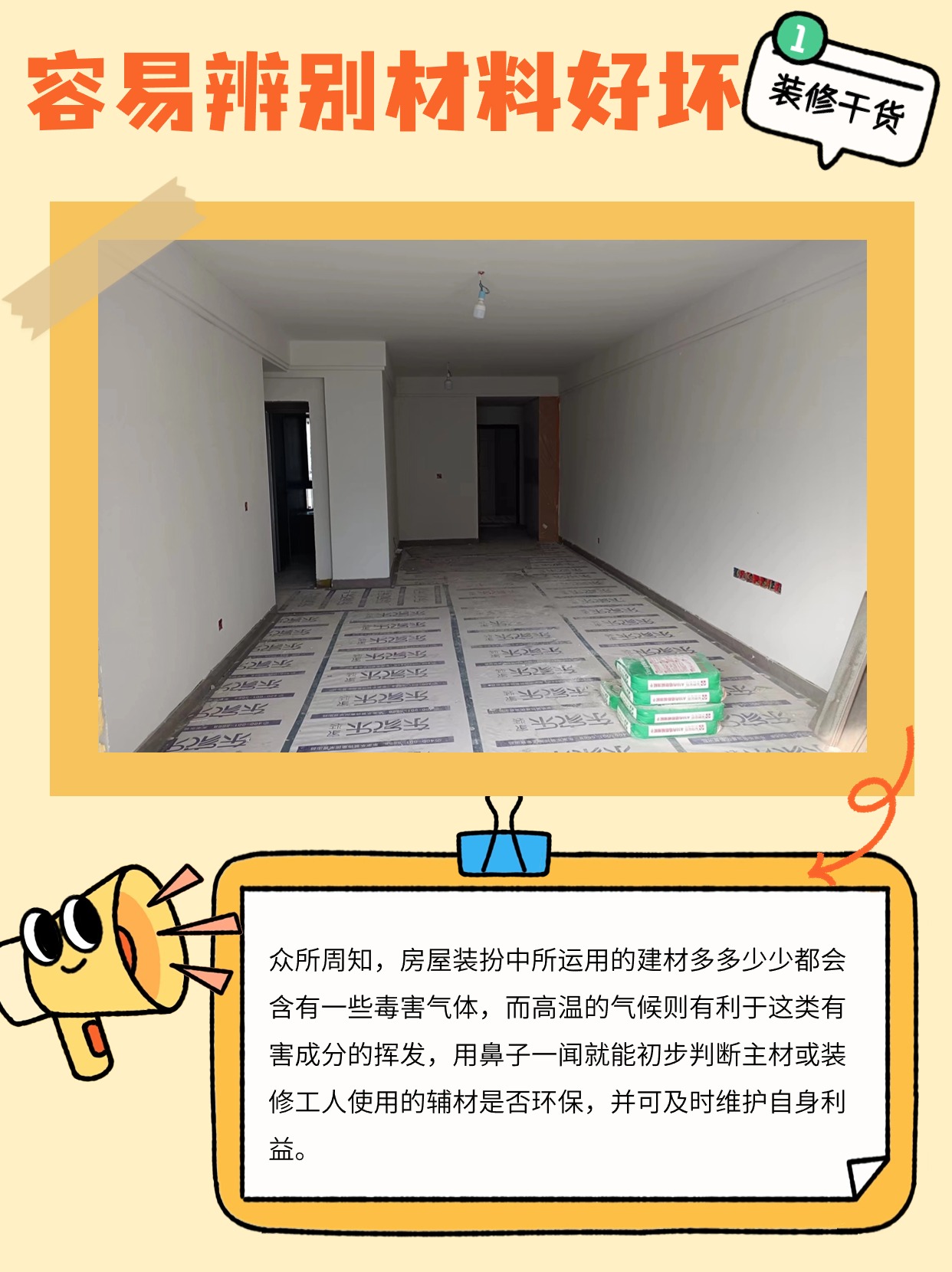 眾所周知,房屋裝扮中所運用的建材多多少少都會含有一些毒害氣體,而高溫的氣候則有利于這類有害成分的揮發,用鼻子一聞就能初步判斷主材或裝修工人使用的輔材是否環保,并可及時維護自身利益。