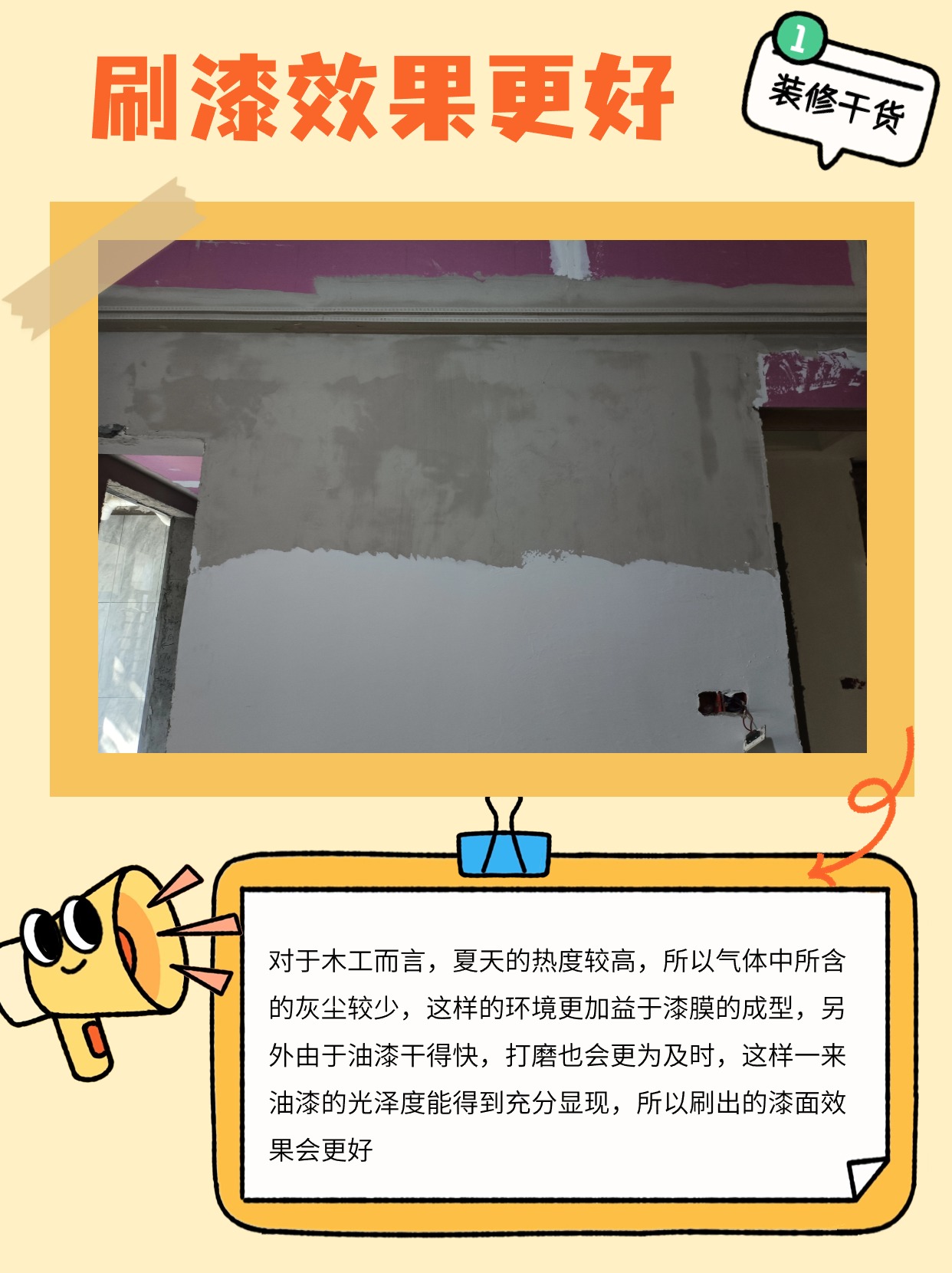 對于木工而言,夏天的熱度較高,所以氣體中所含的灰塵較少,這樣的環境更加益于漆膜的成型,另外由于油漆干得快,打磨也會更為及時,這樣一來油漆的光澤度能得到充分顯現,所以刷出的漆面效果會更好。