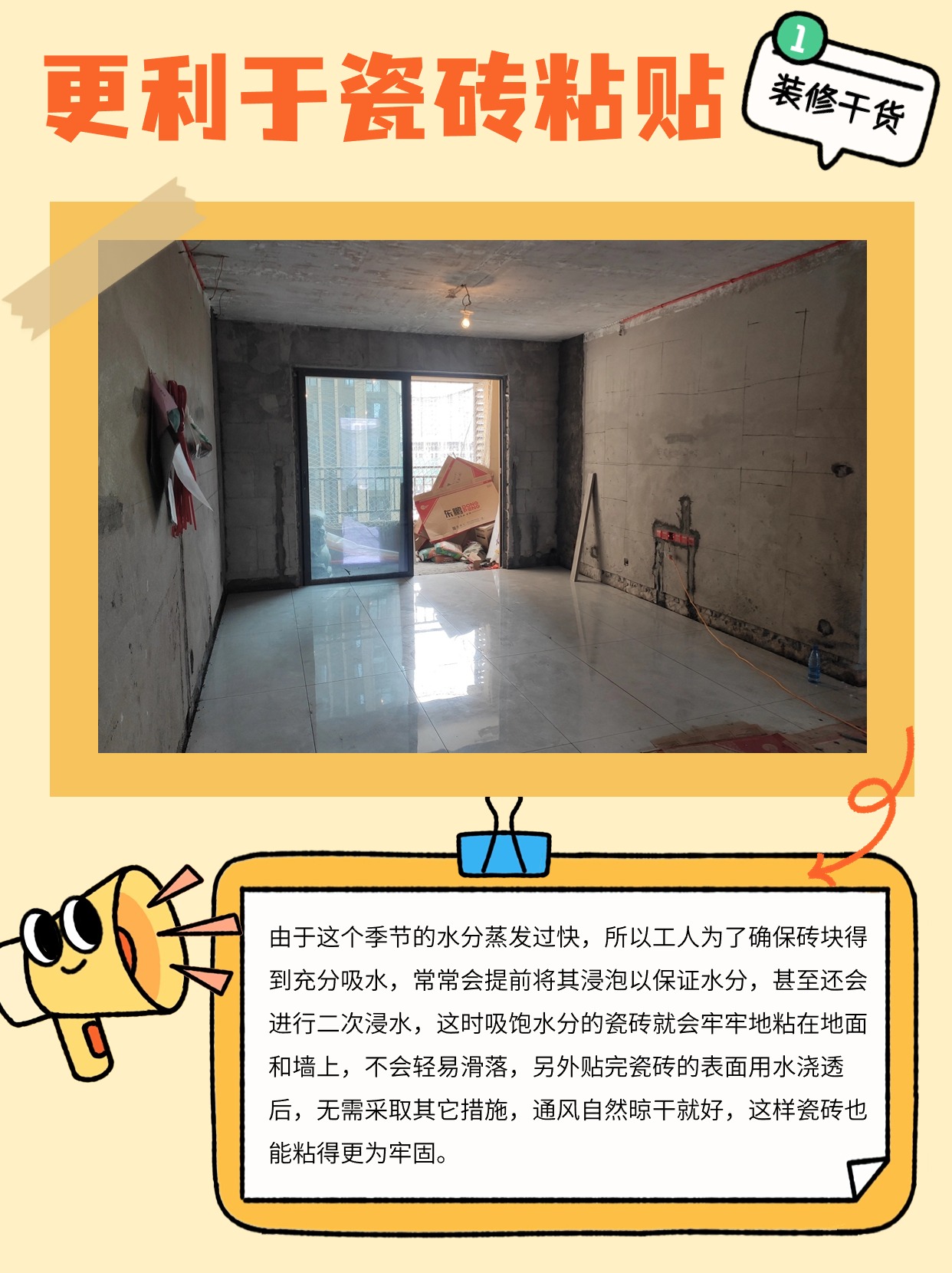 由于這個季節的水分蒸發過快,所以工人為了確保磚塊得到充分吸水,常常會提前將其浸泡以保證水分,甚至還會進行二次浸水,這時吸飽水分的瓷磚就會牢牢地粘在地面和墻上,不會輕易滑落,另外貼完瓷磚的表面用水澆透后,無需采取其它措施,通風自然晾干就好,這樣瓷磚也能粘得更為牢固。