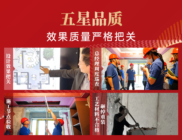 【五星品質(zhì)】嚴守執(zhí)行兩個把關,“設計總監(jiān)團設計效果把關”和“總經(jīng)理施工質(zhì)量把關”承諾。業(yè)主可以對一切設計不滿意、工程不合格說“不”,工程質(zhì)量不合格,總經(jīng)理砸掉重做由東家樂全額買單。正所謂:砸出品質(zhì)、砸出文化、砸出經(jīng)典、砸出放心!