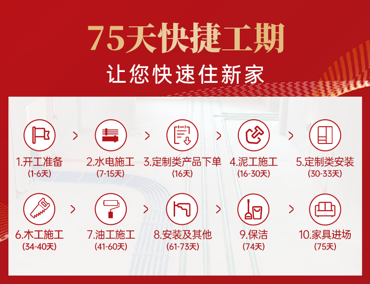 【快捷工期】快捷的75天工期東家樂定制服務量尺自己做,開工三天確定好地面鋪貼好瓷磚后的高度,不外包量尺寸,開工后一周就可以下單生產(chǎn)定制柜子,瓷磚貼完就安裝柜子,直接為客戶節(jié)省45天工期。過程200 多個施工節(jié)點,層層把關,有效提升施工效率,確保工程品質(zhì)快速地完美落地!讓工地開口說話,讓工地形成口碑!