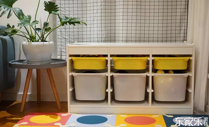 利用墻面拐角處巧做收納柜,木質、透明簡易收納柜輪番上陣,有孩子的家里,最多的就是各種各樣、大大小小的玩具。
