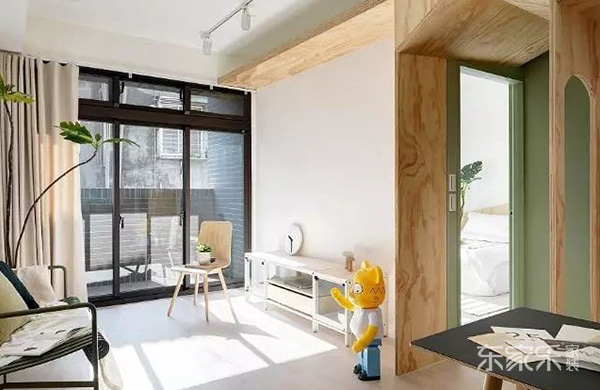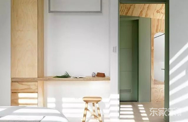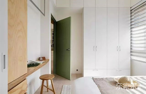 過道這里,用實木做了一個屋頂的造型,這樣直接看過去綠色的一面板其實就是臥室的門來的,選擇綠色的門,凸顯小清新的風格。