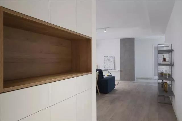 入戶視角,一股簡(jiǎn)約風(fēng)撲面而來,大面積的使用白色,讓空間寬敞又明亮。過道設(shè)計(jì)了一組置物架,擺放居家用品,保持室內(nèi)整潔。