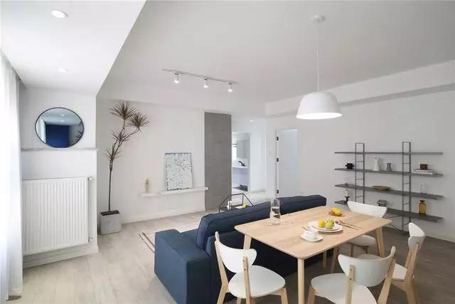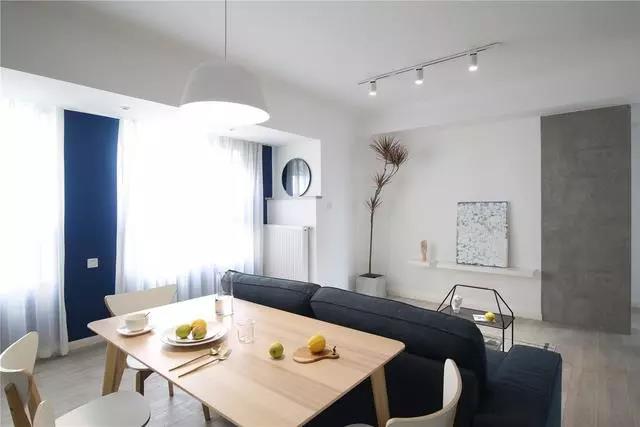 將陽臺(tái)打通并入客廳,擴(kuò)大視覺空間,讓室內(nèi)更顯寬敞。客餐廳一體設(shè)計(jì),空間重復(fù)利用不浪費(fèi)。一抹藍(lán)色點(diǎn)綴,避免空間單調(diào),又具有自己的個(gè)性。