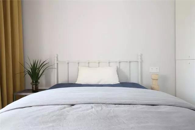 次臥延續(xù)簡(jiǎn)約風(fēng),白色鐵藝床很符合整體風(fēng)格。