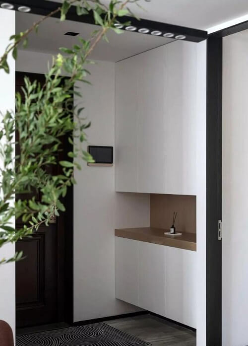 進門的左手邊打造成玄關鞋柜,整體采用白色柜門無拉手設計,中間留出的柜臺可以放一些鑰匙類的小物品,干凈利落又不失家的溫馨感。