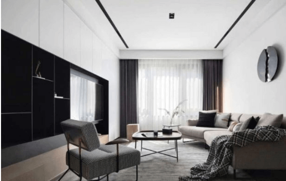 客廳以白色為主調,穿插黑色電視柜和淺灰色沙發,統一中又不乏單調,頂部無主燈設計,淺色布藝沙發搭配線型燈條,簡約個性。