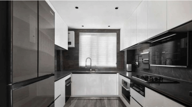 廚房設計成U型結構同樣延續了客廳的黑白灰,上下雙層櫥柜增加儲物空間,高低錯落的搭配設計更顯時尚。