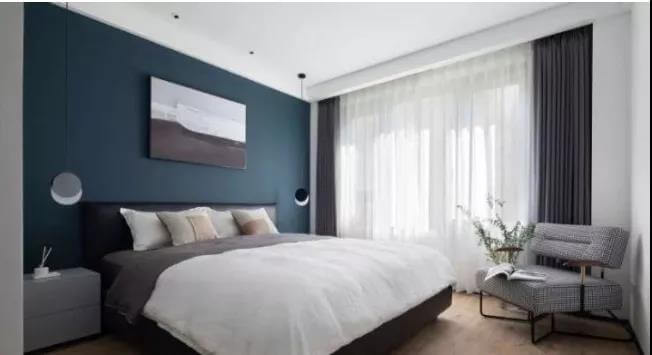 主臥床頭背景大面積用了深藍色,搭配黑色床頭,高級大氣。床尾一張千鳥格紋單椅,為素雅中的環境中添加了一絲俏皮。個性的床頭吊燈,讓你體會每晚都有明月在側的美好。