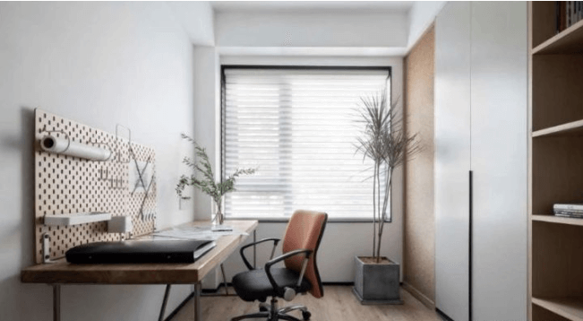 書房和臥室連通,木質大書桌給人一種平靜安穩的感覺,在辦公時容易沉下心來。洞洞板有利于各種圖紙文具的收納。