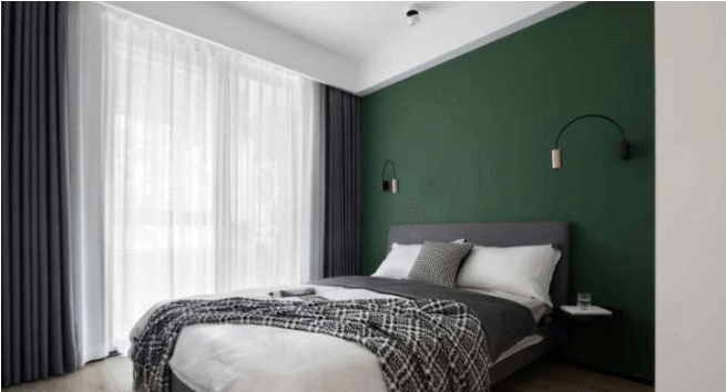 次臥選擇深綠色作為背景,經過了一天忙碌的工作,綠色最能平靜我們焦躁的情緒,有利于放松心情。圓弧形壁燈,金屬質地為整體增添了質感。