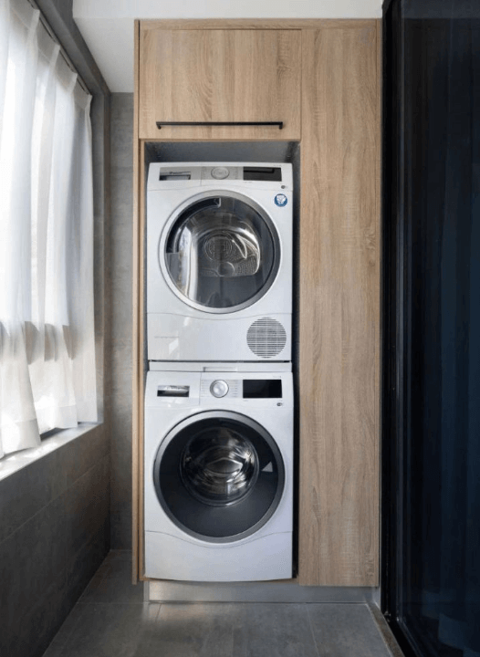 陽臺改造成洗衣房,洗衣機搭配陽臺柜不僅防止洗衣機被長時間暴曬而且還增加了儲物功能,可以收納一些清潔用品。