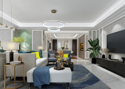 高級灰的的藍色和灰色,添加上金色的邊框,在現在簡約的風格中添加了一部分的輕奢的元素。在設計上更加強調功能,強調結構和形式的完整,更追求材料、技術、空間的表現深度與精確,所以在墻面、頂面來減少沒有必要的裝飾,直接選用了硬朗的結構造型,而在軟裝的顏色上下了很大的功夫,顏色多種,風格統一。業主是一個喜歡安靜,祥和,看上去明朗寬敞舒適的家,來消除工作的疲憊,忘卻都市的喧鬧,所以對于這種現代簡約風格十分地滿意。