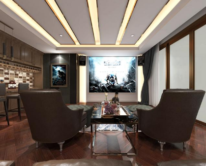 影音室相比明快的其他空間要略顯莊重,重色的運用是為了更加凸顯投影的方向的視覺集中性,旁邊的水吧區在功能上做到了互補,是這個空間的功能完美的形成了閉環,主人在這個空間中可以做到極致的放松和享受。