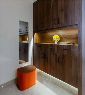 胡桃木材質的整面入戶玄關柜,將儲物功能化,腰線部分空出,暗藏暖黃色感應燈帶,方便業主拿取物品,同時也能給玄關的裝飾品增添燈光氛圍,既美觀又人性化。