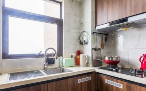 嵌入式冰箱及電器柜,讓廚房限度的發揮其空間利用率,爵士白墻磚、胡桃木的櫥柜配上黑金屬質感的拉手,讓廚房現代感十足的同時又帶點小奢華。