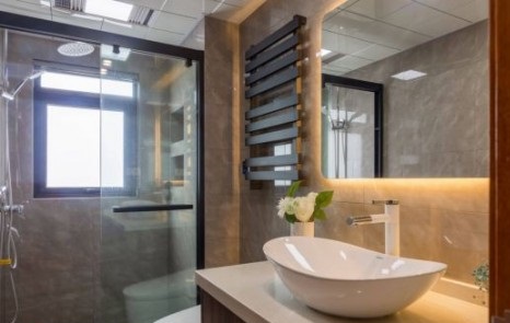 衛生間淋浴獨立分離,獨立臺盆設計讓原本寬敞的衛生間更加通透明亮,簡約的黑白灰為主調,墻面的壁龕和暗藏的暖光,讓衛生間顯得簡潔而優雅。
