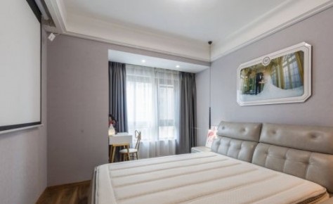 主臥室采用的是霧靄藍色調墻布,胡桃木色地板和皮質床頭,彰顯出臥室的時尚感。設計師打掉了主臥室原本的飄窗,增加了空間使用,透過窗簾到達室內的光線,讓房間通透感十足。