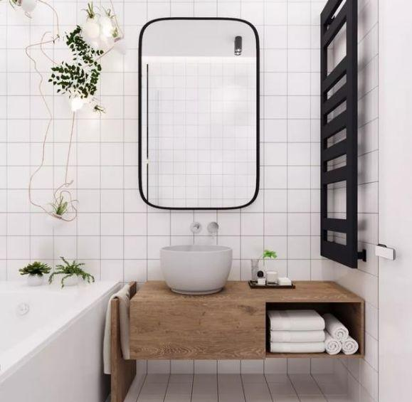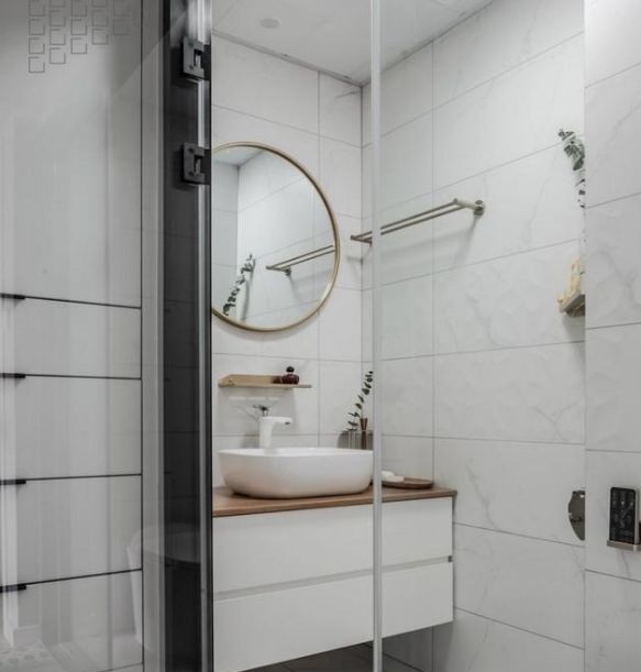 一般來講,衛生間不建議使用太白的瓷磚,那樣會容易臟,而且沒有層次,建議大家使用淺灰色調或者深淺搭配,而地面使用300×300的小磚能夠顯得衛生間空間大,上圖是北歐風格的衛生間,以黑白灰三個色系為主,結合復古磚和面包磚,營造出一種年輕時尚藝術感的空間氣息,最重要的是輪廓分明,對于一些弱視的朋友來說,實際使用會更加友好一些;