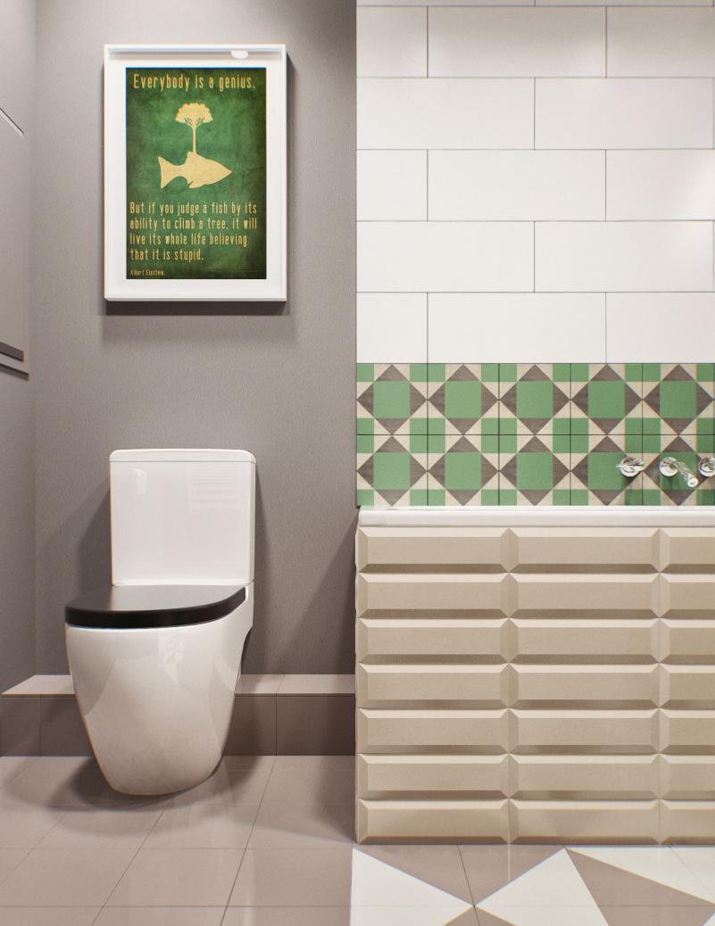 淺色的瓷磚,用綠色做點(diǎn)綴,營(yíng)造出室內(nèi)空間的豐富感。地面不同的瓷磚鋪貼方式,將功能區(qū)更加清晰的劃分。
