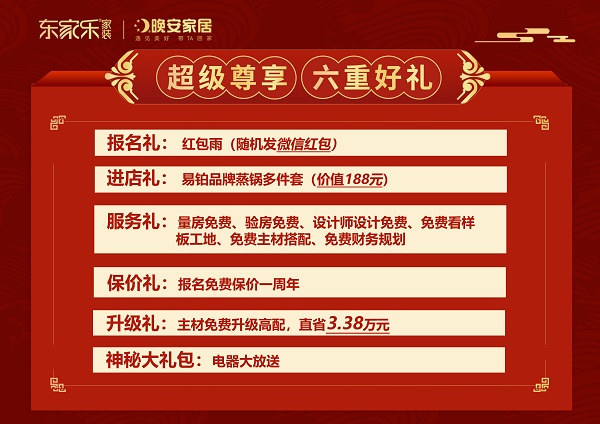 東家樂家裝新春開門紅·新品上市,為搶定的VIP業主送上鉅惠大禮包——“百萬紅包·千萬補貼”裝修鉅惠,晚安品牌家具10大件鉅惠加增禮,品牌家電大禮包限時送,還有一線品牌新品材料免費升級禮,精工工藝免費升級禮,以及開門紅大吉大利鉅惠紅包上門抽。東家樂家裝讓新春第一批樣板房搶定業主奉上前所未有的VIP特權專享福利。