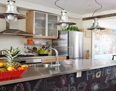 能夠自然隨意彎曲的別致吊燈已經(jīng)足夠成為這間廚房的亮點(diǎn),而在下方櫥柜背后還有大塊面的黑板設(shè)計(jì)也足夠讓人過目不忘。這樣的廚房一定是為了家中有調(diào)皮寶貝的家庭所設(shè)計(jì),忙于烹飪的主婦們?cè)谂腼兊耐瑫r(shí),也許會(huì)無(wú)暇顧及到一旁好動(dòng)的寶貝,那么就可以讓小朋友在這面黑板前用心作畫吧。