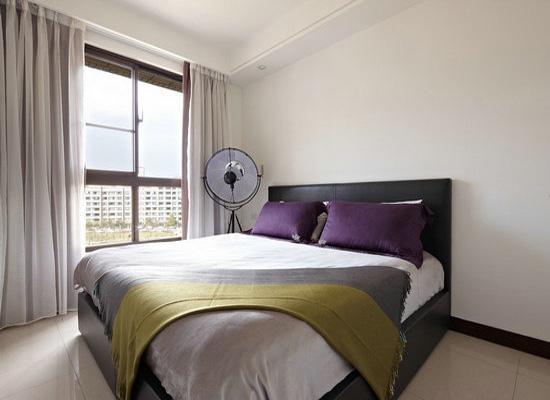 臥房是屬于私人的領(lǐng)地,大家可以根據(jù)自己的需要和喜歡來(lái)進(jìn)行布置。圖中這款臥房的布置非常的簡(jiǎn)單,白色的墻面搭配白色的地板,顯得很亮堂。臥房?jī)?nèi)家具很少,黑色的實(shí)木床上鋪著銀灰色的床單,紫色的抱枕,顯得很雅致。