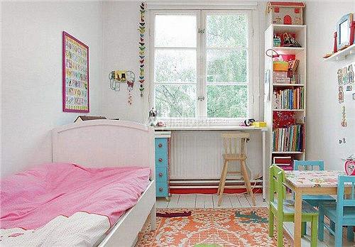 這是一個(gè)孩子的臥房,為了給孩子騰出更多的活動(dòng)空間,主人選用了體積較小的單人床,為了方便孩子玩耍,主人還在地上鋪著精美的黃色的地毯。臥床對(duì)面擺著小桌子和小凳子,孩子們可以在這里一起搭積木、玩玩具。窗臺(tái)的位置則打造成了雅致的學(xué)習(xí)區(qū)。