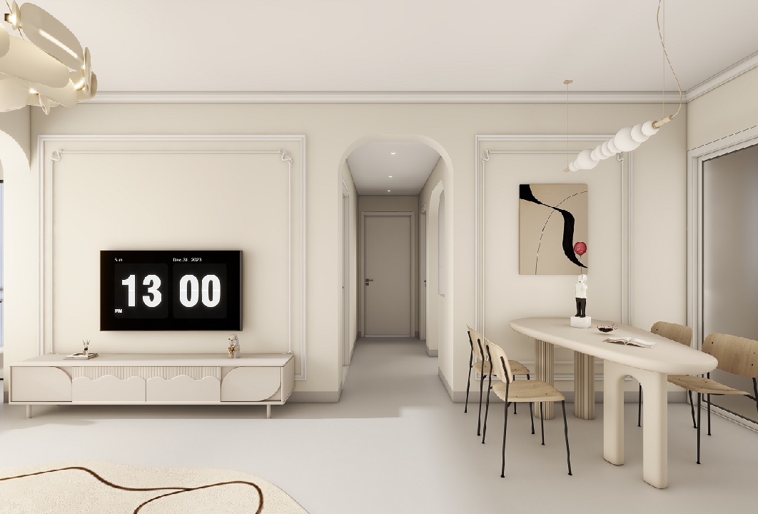 色彩方面,現代奶油風強調淡雅、溫和且略帶復古感的奶白色調,這種色調猶如新鮮奶油般溫潤細膩,營造出寧靜、和諧的空間氛圍。通常會搭配淺木色或米灰色等相近色調,以此來強化整體空間的統一性和連貫性。